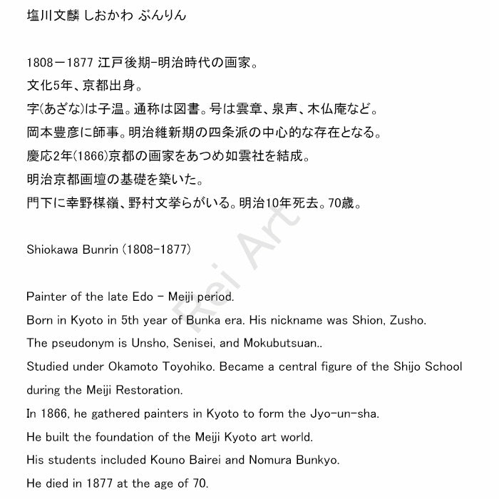 The artist, Bunrin, was a leading figure of the Shijō school from the late Edo to early Meiji period. Among his pupils were Kōno Bairei and Nomura Bunkyō, making Bunrin a foundational figure in the development of the modern Kyoto painting scene.