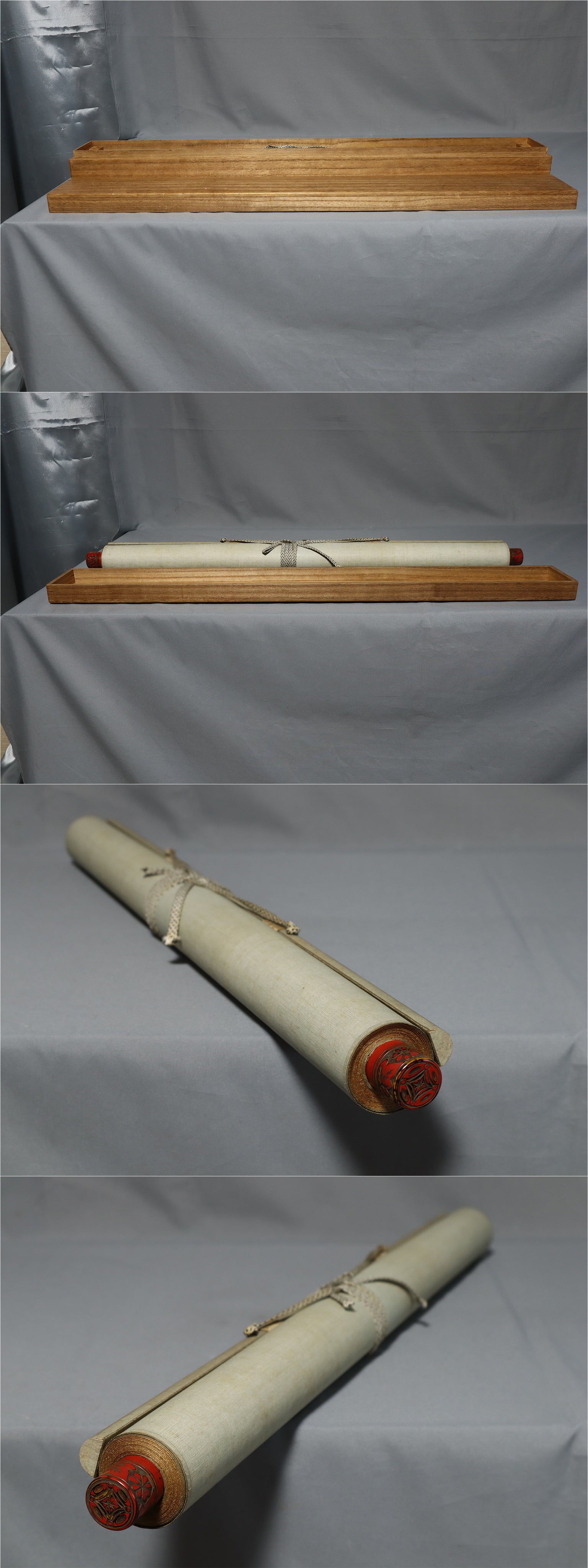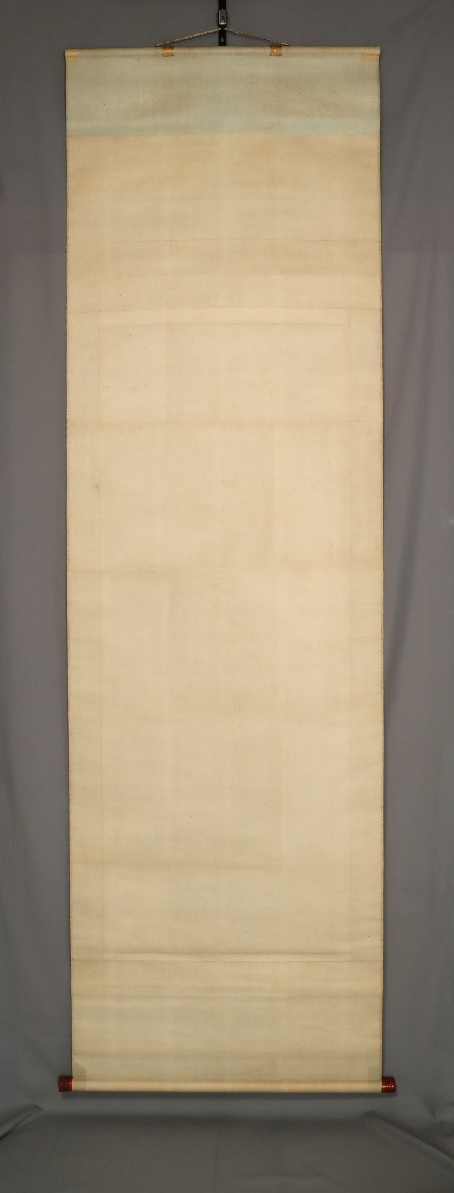 Although the scroll ends (jikusaki) have been replaced, the vermilion lacquered ends are also antique and harmonize well with the overall age of the piece.